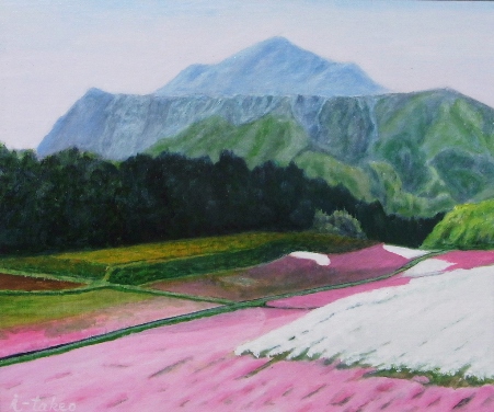 秩父・甲武山を遠景に、今でも採掘が続いている石灰岩の山肌を中ほどに、芝桜で有名な羊山公園を手前に配して描いた「故郷の風景」と、