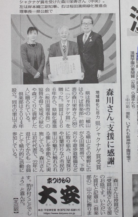 森川栄壽さんが、滋賀県のシャクナゲ賞を受けられました。